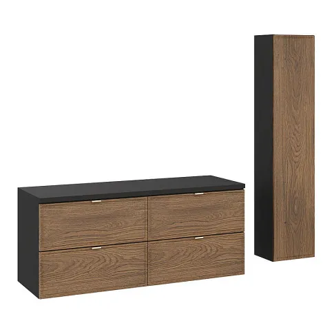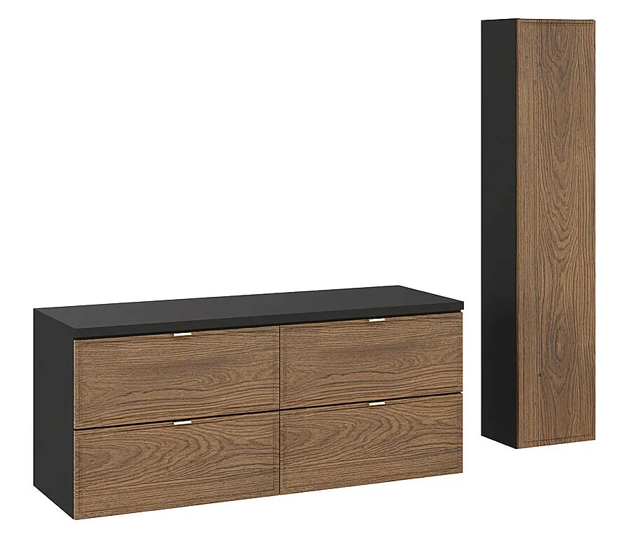 Zestaw Arvenax 8X marki Edinos Premium to duet praktycznych mebli łazienkowych, który łączy kompaktową szafkę z czterema szufladami oraz pojemny słupek wiszący. To idealne rozwiązanie do wnętrz, w których liczy się zarówno porządek, jak i nowoczesna estetyka. Fronty z naturalnym rysunkiem drewna i czarne korpusy tworzą wyrafinowany kontrast, a złote uchwyty dodają subtelnej elegancji. Czy nie warto wyposażyć łazienki w zestaw, który pomieści wszystko i nadal wygląda znakomicie?