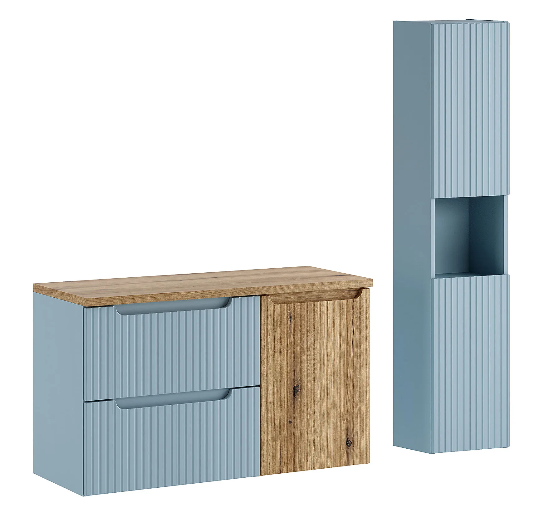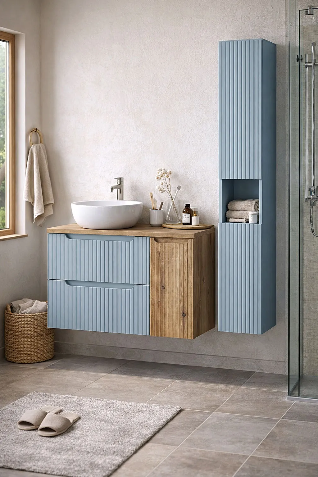 Zestaw mebli łazienkowych Arvessi 16X marki Edinos Premium to praktyczne rozwiązanie dla osób, które chcą dobrze wykorzystać przestrzeń w łazience i jednocześnie zachować porządek bez dodatkowych pojemników czy koszy stojących na podłodze. W komplecie znajduje się szafka pod umywalkę z wbudowanym koszem na pranie oraz wysoki słupek, który zapewnia dodatkowe miejsce na ręczniki, kosmetyki i domowe zapasy.To rozwiązanie, które dobrze odnajdzie się zarówno w mniejszej łazience, jak i w większej przestrzeni, gdzie liczy się estetyka i funkcjonalny układ przechowywania.