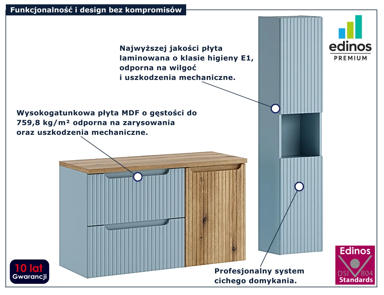 • Produkt posiada certyfikat jakości "Edinos Standards DSI 804", który potwierdza najwyższą jakość wykonania mebla oraz pełny stopień zgodności poszczególnych jednostek wytworzonego wyrobu z przyjętym wzorcem.