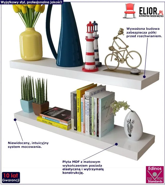 - Kolor: biały. Kliknij w link i sprawdź także inne półki ścienne w sklepie Edinos.pl. Stwórz swój praktyczny zestaw mebli.