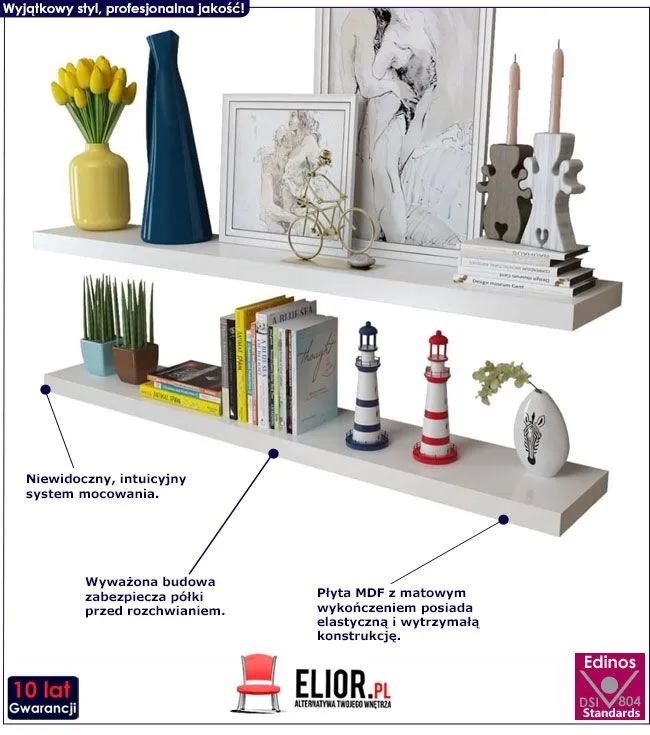 - Kolor: biały. Kliknij w link i sprawdź także inne półki ścienne w sklepie Edinos.pl. Stwórz swój praktyczny zestaw mebli.