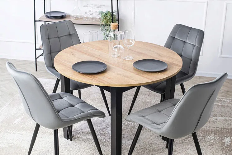 Rozkładany okrągły stół z szarymi krzesłami Ninyra