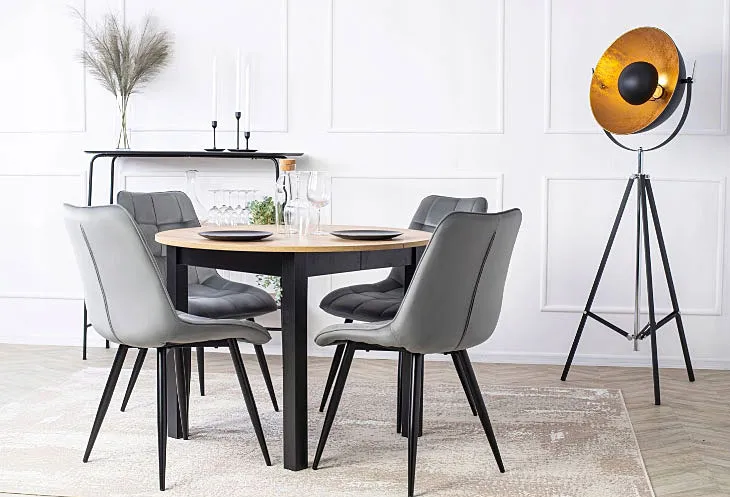 Okrągły rozkładany stół z 4 szarymi krzesłami Ninyra