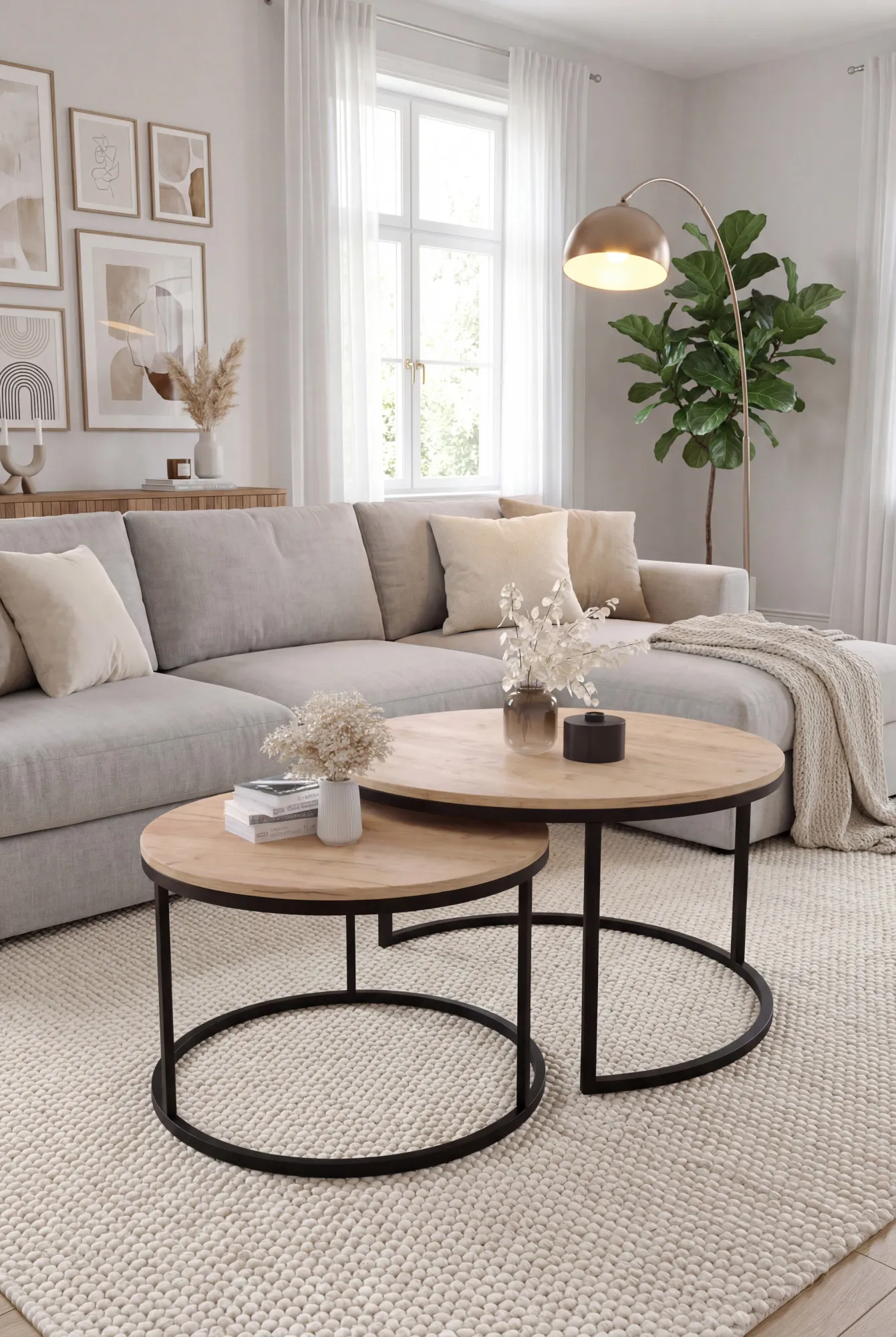 Aranżacja salonu z zestawem stolików dąb craft złoty Averdiq 3X