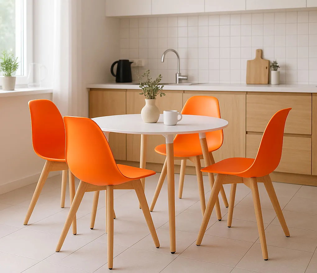 Kuchnia skandynawska z kompletem pomarańczowych krzeseł Pipi