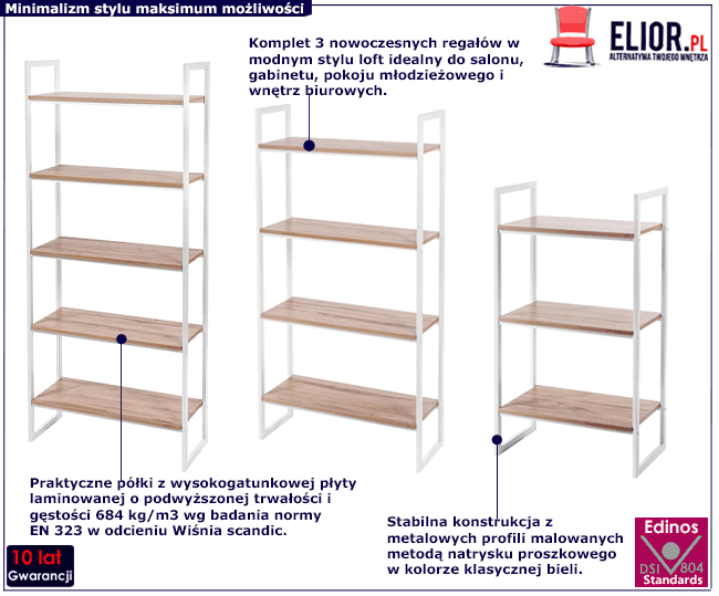 Komplet loftowych regałów Maso 13X marki Elior to zestaw stworzony z myślą o osobach poszukujących mebli o najwyższych parametrach jakościowych i ponadczasowym designie. Komplet Maso 13X wyróżnia się zastosowaniem nowoczesnych komponentów, bezpiecznych w użytkowaniu i gwarantujących niezmienną jakość na lata użytkowania. Konstrukcja kolekcji Maso 13X powstała z profesjonalnego metalu nierdzewnego, pomalowanego proszkowo profesjonalnym barwnikiem w odcieniu klasycznej bieli. Najwyższa jakość techniki metody natrysku proszkowego pozwoliła zaoferować firmie Elior aż 10 lat gwarancji na swoje produkty. Technika malowania proszkowego charakteryzuje się dużą trwałością, odpornością na korozję, chemikalia, wysoką temperaturę oraz uszkodzenia mechaniczne, dzięki czemu znacznie podnosi walory użytkowe i estetyczne mebla. Regały kompletu Maso 13X zostały wyposażone w praktyczne półki z naturalnej płyty laminowanej o podwyższonej trwałości i gęstości. Płyta została zbudowana z włókien drzewnych i związków organicznych w warunkach wysokiego ciśnienia i temperatury. Poszczególne włókna są ułożone są różnokierunkowo, o strukturze sinusoidalnej, co podnosi parametry wytrzymałościowe i jakościowe surowca. Dodatek szlachetnych filmów melaminowych zwiększa trwałość płyty oraz pozytywnie wpływa na jakość i estetykę mebla. Półki o grubości 18 mm zostały przykręcone do metalowych profili specjalistycznymi metalowymi śrubami, dzięki czemu są wyjątkowo stabilne i wytrzymałe na nacisk. Tak zaprojektowane regały Maso 13X marki Elior stanowią fenomenalny zestaw trwałych i funkcjonalnych mebli o wyjątkowo uniwersalnym przeznaczeniu.