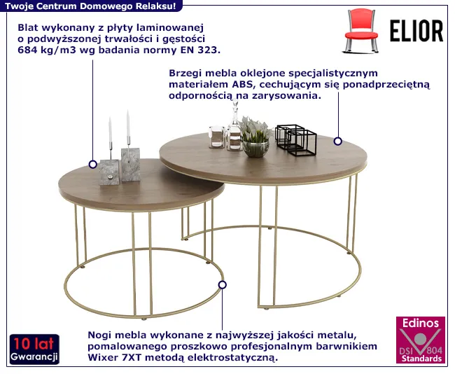 Niezależnie od tego, czy potrzebujesz miejsca na podanie kawy i przekąsek podczas spotkań z przyjaciółmi, czy chcesz stworzyć eleganckie wnętrze w swoim salonie, zestaw dwóch okrągłych stolików kawowych Eksa 3X marki Elior jest idealnym wyborem. Będą one wyjątkowym akcentem w Twoim domu, przyciągając wzrok i zapewniając wygodę. Zdecyduj się już dzisiaj na zakup w rewelacyjnej cenie! Powyższa oferta dotyczy zestawu stolików w promocyjnej cenie 738 zł. Regularna cena tego kompletu to 898 zł. Zamawiając go właśnie teraz zyskujesz aż 160 zł!