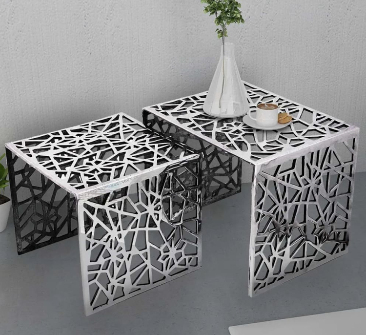 Zestaw dwóch stolików kawowych Ontes wykonany został z najwyższej jakości aluminium. Jest to drugi po żelazie najczęściej stosowany metal w wielu gałęziach przemysłu, ponieważ łączy w sobie unikalną kombinację wielu pożądanych właściwości. W wystrojach wnętrz najważniejsze są jednak walory estetyczne. Srebrzysta, błyszcząca barwa idealnie wpasuje się do każdego wnętrza i sprawia, że aluminium tak dobrze się prezentuje. Wygląd to jednak nie jedyna zaleta tego niezwykłego tworzywa. Jego powierzchnia w środowiskach naturalnych podlega pasywacji, czyli pokrywa się tlenkami własnymi, które tworzą szczelną powłokę zapobiegającą rdzewieniu. Dzięki temu mebel pozostaje zawsze piękny i w idealnej formie. Poza tym aluminium jest niezwykle lekkie co pozwala na łatwe przenoszenie mebli z niego wykonanych.