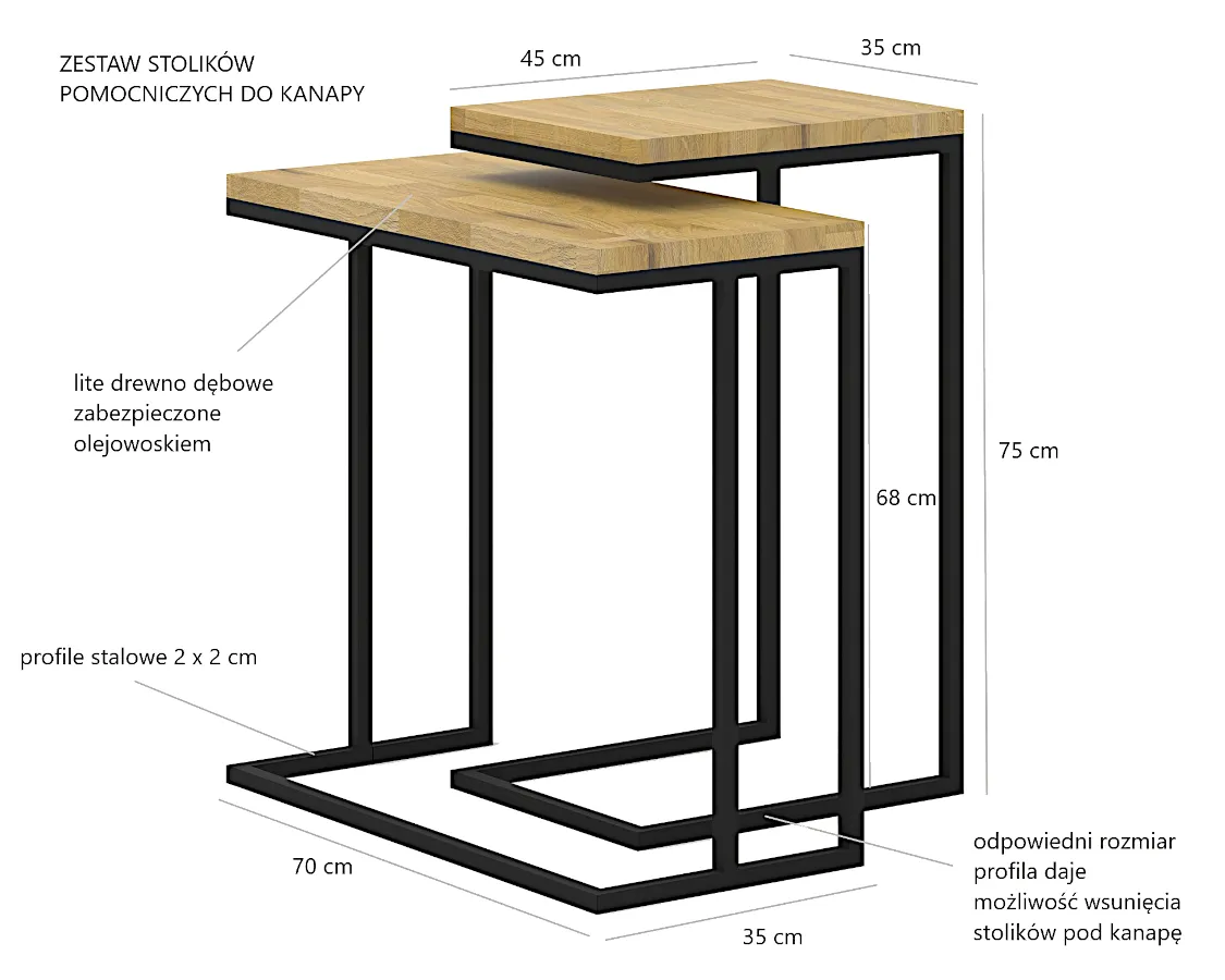 • Wymiary mniejszego stolika: szerokość 70 cm, głębokość 35 cm, wysokość 68 cm.