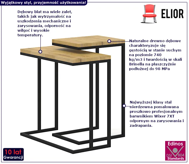 Oglądając meble najpierw zwracamy uwagę na to jak się prezentują, co oczywiście jest bardzo ważne. Każdemu z nas zależy na jak najlepszym wyglądzie mieszkania. Niestety nie wszystkie piękne meble mają tak samo zachwycającą jakość. Duet stolików pomocniczych Lexor 3X marki Edinos Premium nie dość, że zachwycają wyglądem to i również jakością materiałów z których są zrobione. Blat stolika został stworzony z litego drewna dębowego zabezpieczonego olejowoskiem. Drewno to  charakteryzuje się gęstością w stanie suchym na poziomie do 740 kg/m3 i twardością w skali Brinella na płaszczyźnie podłużnej do 98 MPa. Na korzyść drewna dębowego przemawia jego ciężar i odporność na odkształcenia. Dębowy blat ma wiele zalet, takich jak wytrzymałość na uszkodzenia mechaniczne i zarysowania, odporność na wilgoć i wysokie temperatury. Nie straszne mu twoje gorące jedzenie. Konstrukcja mebla wykonana została z najwyższej jakości metalu/stali nierdzewnej, pomalowanej proszkowo metodą elektrostatyczną. Dzięki temu mebel jest odporny na zarysowania i zadrapania. Najwyższa jakość techniki metody natrysku proszkowego pozwoliła zaoferować marce Edinos Premium aż 10 lat gwar. na swoje produkty. Technika malowania proszkowego charakteryzuje się dużą trwałością, odpornością na korozje, chemikalia oraz uszkodzenia mechaniczne, dzięki czemu znacznie podnosi walory użytkowe i estetyczne mebla.