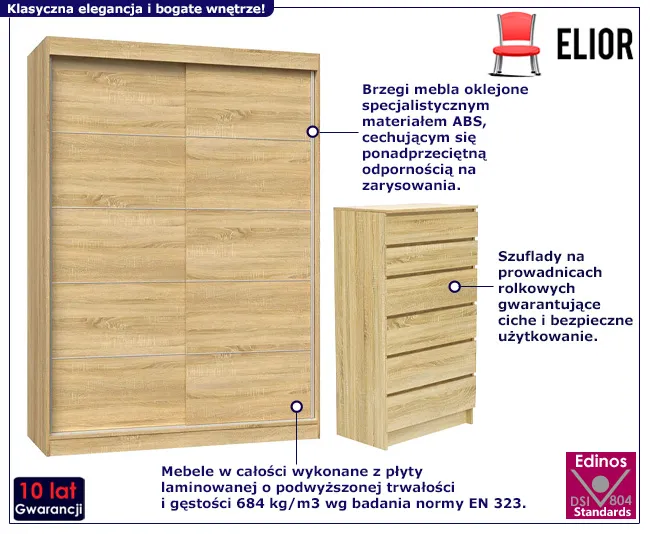 Meble z zestawu Sargio marki Elior wykonano z wykorzystaniem naturalnej płyty meblowej, zbudowanej z włókien drzewnych i związków organicznych w warunkach wysokiego ciśnienia i temperatury. Włókna ułożone są różnokierunkowo, o strukturze sinusoidalnej, co zapewnia nadanie jej cech jakościowych oraz wytrzymałościowych. Dodatkowo płyta została uszlachetniona cienkimi filmami melaminowymi w celu zwiększenia jej trwałości. Brzegi mebli oklejono specjalistycznym materiałem ABS, cechującym się ponadprzeciętną odpornością na zarysowania i uszkodzenia mechaniczne. Praktyczne przesuwne drzwi szafy, zdobione szprosami, umieszczono na trwałej prowadnicy rolkowej, co zaoszczędza dodatkową przestrzeń, dlatego doskonale sprawdza się nawet w wąskich wnętrzach. Przekonaj się sama!