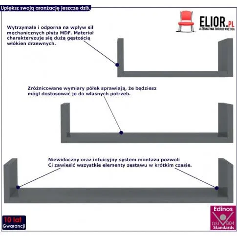 Wszystkie produkty marki Edinos Premium tworzone są według najwyższych standardów. Dzięki dużej odporności także okres ich gwarancji jest dłuższy niż w przypadku konkurencyjnych produktów. Półki Dunan 3X zostały skonstruowane z wysokiej jakości płyty. Użyty materiał charakteryzuje się dużą gęstością włókien drzewnych, co bezpośrednio wpływa na jego wytrzymałość oraz niełamliwość. Niewidoczny montaż stanowi jednocześnie gwarant wyjątkowo trwałego mocowania. Do kompletu załączono śrubki oraz kołki rozporowe – zawieszenie całości zajmie Ci zatem jedynie chwilę. Istotnym niuansem produktu pozostaje jego lśniące, eleganckie wykończenie. Nadaje ono półkom dodatkowej estetyki, a także sprawia, że powierzchnię łatwo jest czyścić.