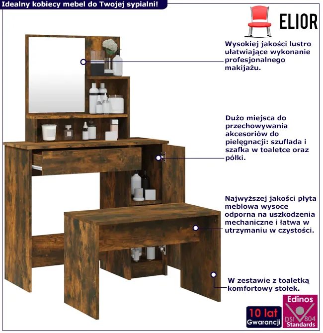 • Kolor: przydymiony dąb. W naszej ofercie posiadamy także inne toaletki z krzesłami.