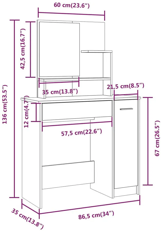 • Wymiary toaletki: szerokość 86,5 cm; głębokość 35 cm; wysokość 136 cm