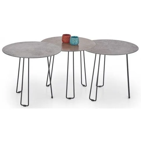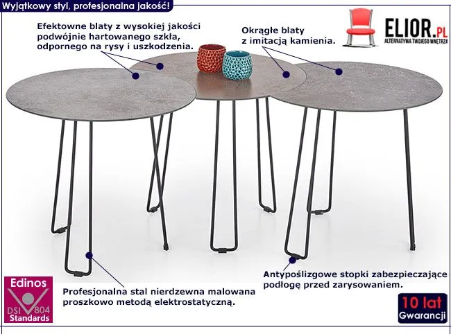 - Modne kolory: 1 blat mebla brązowy z efektem kamienia, 2 blaty popielate z imitacją kamienia, konstrukcja w kolorze czarnym. Kliknij w link i sprawdź także inne okrągłe stoliki w sklepie Edinos.pl. Stwórz swój praktyczny zestaw mebli.