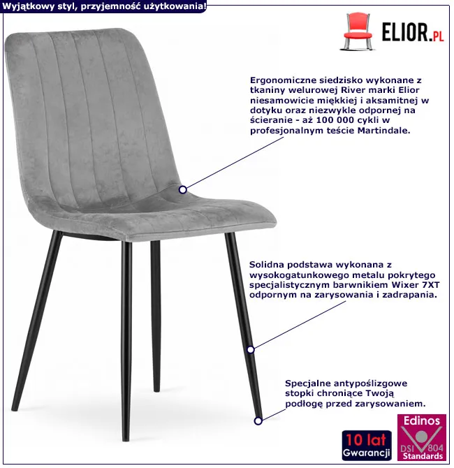 Nogi krzeseł Hallker marki Edinos Premium wykonano z wysokogatunkowego metalu pokrytego specjalistycznym odpornym na zarysowania i zadrapania. Krzesło wytrzyma obciążenie aż 120 kg. Dzięki najwyższej jakości tkaninie obiciowej River marki Edinos Premium nie musisz się martwić o wymianę tapicerki. Ta tkanina welurowa jest nie tylko przyjemnie miękka, ale także niezwykle wytrzymała i łatwa w utrzymaniu w czystości. Zniesie naprawdę wiele, co jest niezwykle ważne przy krzesłach, na których jemy i łatwo o zabrudzenia. Zestaw krzeseł Hallker to wybór na lata.