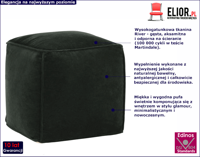 Pufa to jeden z elementów meblarskich i chociaż jedni decydują się na jej zakup ze względów użytkowych, to inni kierują się wizualnymi zaletami, dzięki którym staje się ona główną dekoracją ulubionego pomieszczenia. Nie jest to błędny trop, ponieważ zarówno pierwszy jak i drugi motyw może być adekwatny co do wielu produktów, jednak ten prezentowany przez nas łączy obie zalety! Niezwykła miękkość siedziska, kształt, dogodne wymiary oraz wykonanie i najwyższej jakości materiały pozwalają na osiągnięcie najwyższej satysfakcji z jej użytkowania. Aksamitny puf to ponadczasowa dekoracja nadająca wnętrzu klimatu i estetyki. Siadając na pufie Istro 3X poczujesz się bezpiecznie i wygodnie, ponieważ przyjemna w dotyku tkanina River otuli Twoje ciało zapewniając tym samym komfort podczas relaksu. Wspomniana tkanina to designerska tapicerka, gęsta i aksamitna tkanina obiciowa typu velvet. Materiał ten jest niesamowicie miękki i aksamitny w dotyku, a do tego lekko połyskuje dodając całości szlachetności i elegancji. River to jeden z francuskich welurów posiadający bardzo dobrą odporność na ścieranie (do 100 000 cykli - test Martindale). Dodatkowo wnętrze siedziska zostało wypełnione najwyższej jakości bawełną, która jest niezwykle miękka i wygodna, dzięki czemu dopasuje się do postawy przybranej przez Twoje ciało. Jest ona także antyalergiczna i naturalna, co świadczy o całkowitym bezpieczeństwie dla środowiska i ludzi. Takie cechy mebla potrafią zaimponować, ale jest coś co jeszcze bardziej Cię urzeknie! Głęboka kolorystyka siedziska to możliwość dopasowania go do pomieszczeń takich jak salon, przedpokój czy sypialnia zaaranżowanych w stylu glamour, nowoczesnym, minimalistycznym lub skandynawskim.