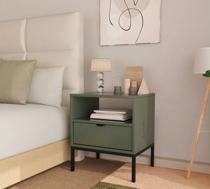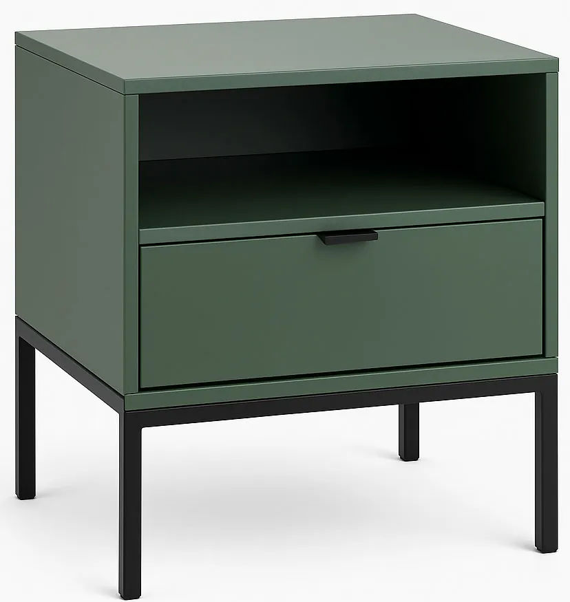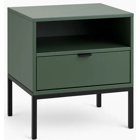 Zielona szafka nocna na nóżkach z szufladą i półką Omeria