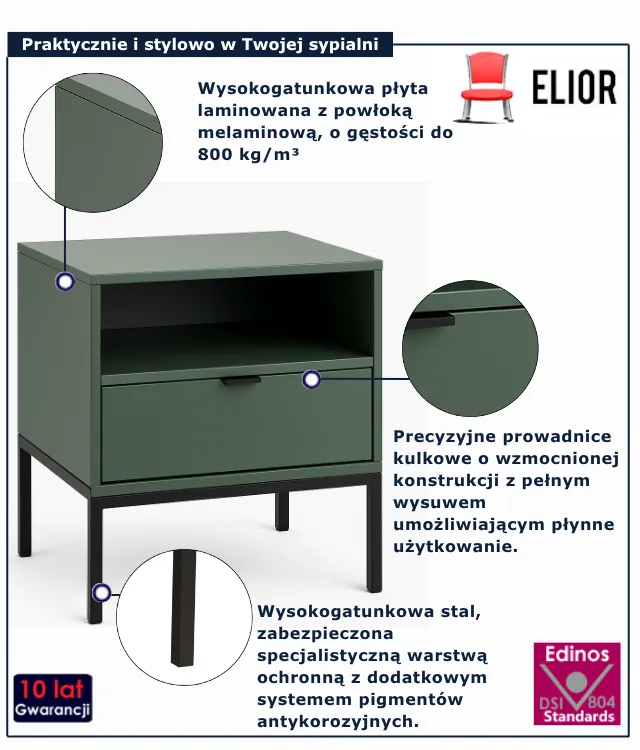 • Produkt posiada certyfikat jakości "Edinos Standards DSI 804", który potwierdza najwyższą jakość wykonania mebla oraz pełny stopień zgodności poszczególnych jednostek wytworzonego wyrobu z przyjętym wzorcem.