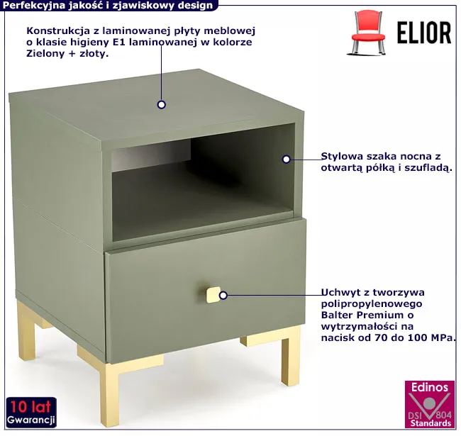 • Produkt posiada certyfikat jakości "Edinos Standards DSI 804", który potwierdza najwyższą jakość wykonania mebla oraz pełny stopień zgodności poszczególnych jednostek wytworzonego wyrobu z przyjętym wzorcem.