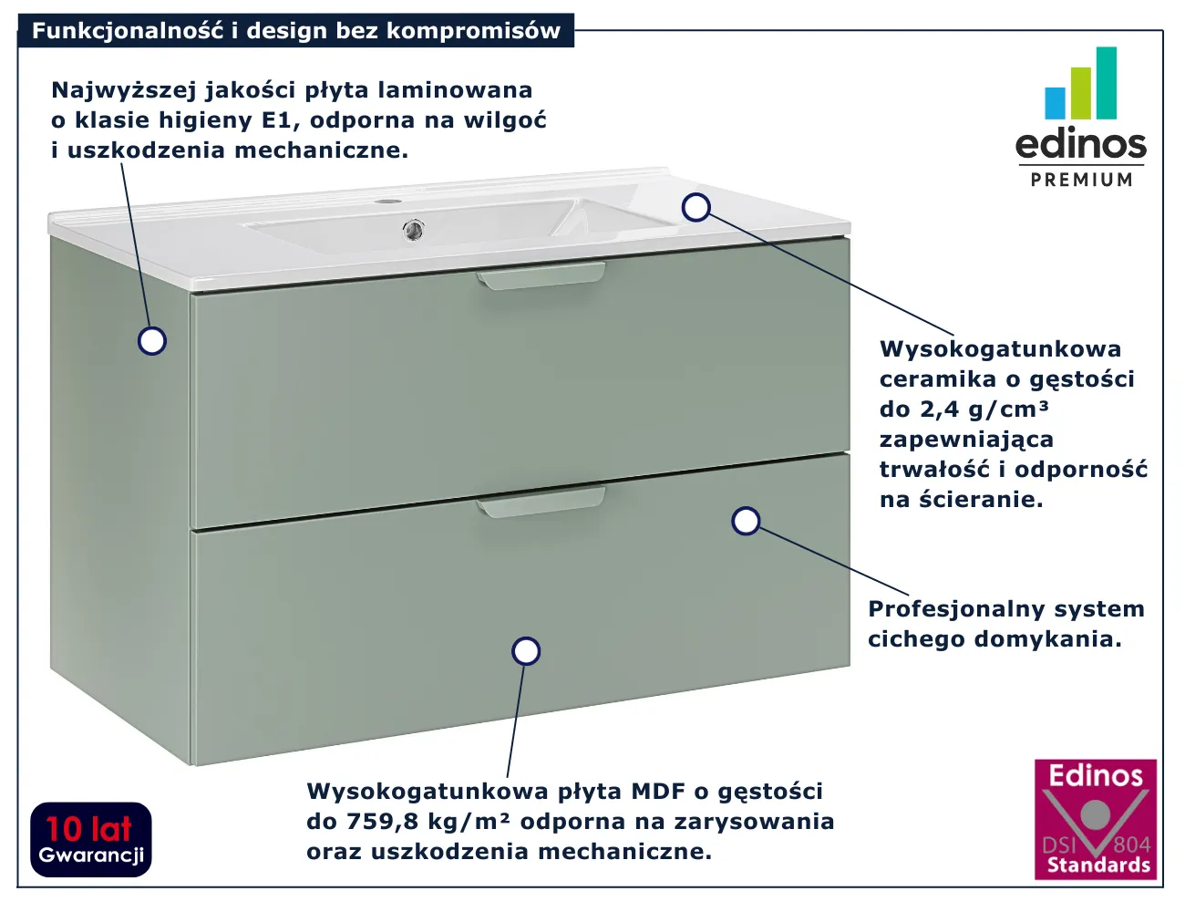 • Produkt posiada certyfikat jakości "Edinos Standards DSI 804", który potwierdza najwyższą jakość wykonania mebla oraz pełny stopień zgodności poszczególnych jednostek wytworzonego wyrobu z przyjętym wzorcem.