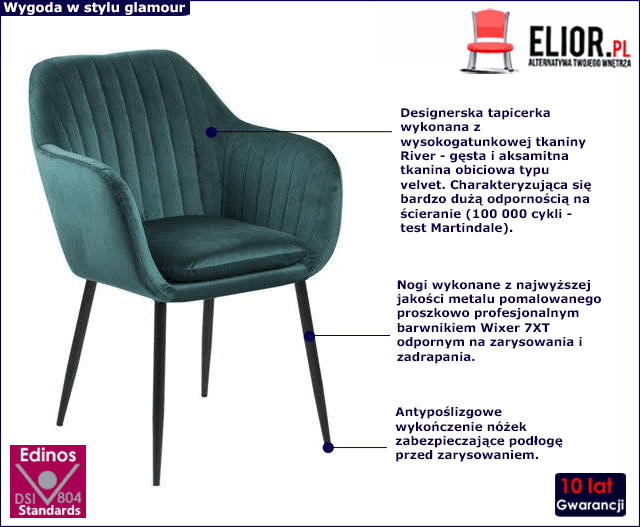 Designerska tapicerka mebla w wykonana została z wysokogatunkowej tkaniny River - to gęsta i aksamitna tkanina obiciowa typu velvet. Materiał ten jest niesamowicie miękki i aksamitny w dotyku, a do tego lekko połyskuje dodając całości szlachetności i elegancji. River to jeden z francuskich welurów posiadający bardzo dobrą odporność na ścieranie (do 100 000 cykli - test Martindale). Konstrukcja mebla wykonana została z najwyższej jakości metalu/stali nierdzewnej pomalowanej proszkowo odpornym na zarysowania i zadrapania. Najwyższa jakość techniki metody natrysku proszkowego pozwoliła zaoferować firmie Elior aż 10 lat gwar. na swoje produkty. Technika malowania proszkowego charakteryzuje się dużą trwałością, odpornością na korozję, chemikalia, wysoką temperaturę oraz uszkodzenia mechaniczne, dzięki czemu znacznie podnosi walory użytkowe i estetyczne mebla. Ponadto nóżki zostały wyposażone w antypoślizgowe wykończenie, które chroni i zabezpiecza podłogę przed zarysowaniami i uszkodzeniami mechanicznymi.