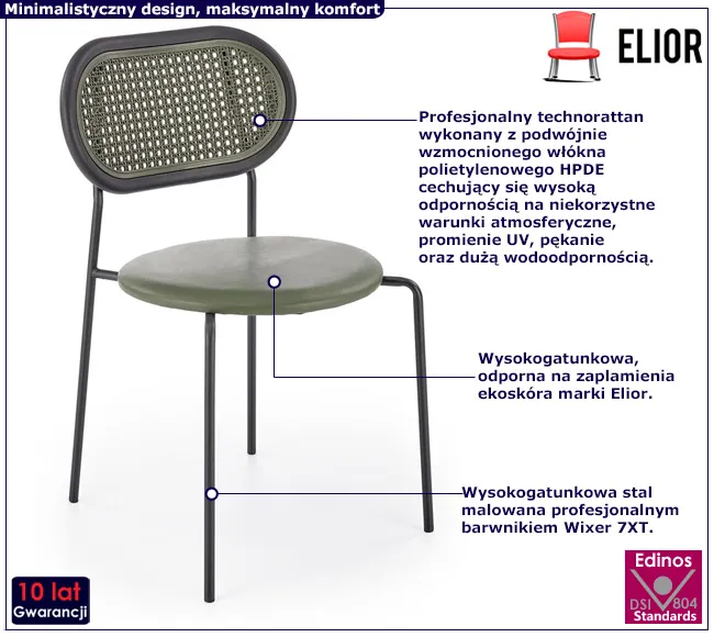 • Oparcie z technorattanu: Unikalne oparcie wykonane z plecionki rattanowej dodaje krzesłu naturalnego uroku, nadając mu wyjątkowy charakter. Technorattan jest nie tylko trwały, ale również ekologiczny, co czyni to krzesło jeszcze bardziej atrakcyjnym.