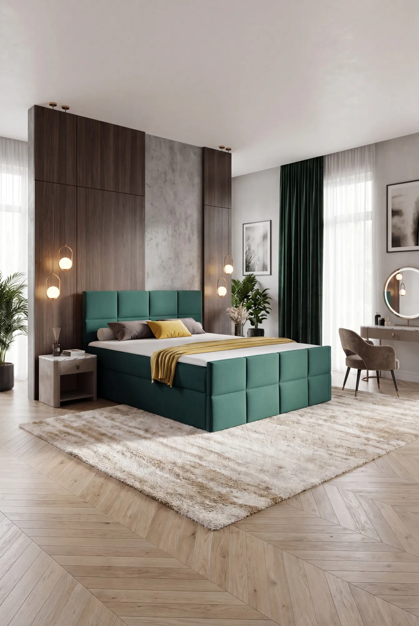 Aranżacja sypialni z zielonym łóżkiem kontynentalnym Valmerio