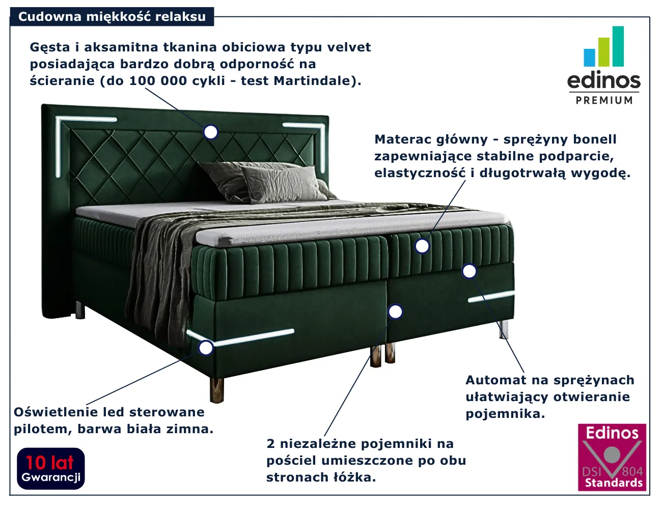 Solterro marki Edinos Premium to łóżko kontynentalne zaprojektowane z myślą o osobach ceniących połączenie nowoczesnego designu z maksymalnym komfortem. Charakterystyczne, geometryczne przeszycia na wezgłowiu oraz efektowne oświetlenie LED sterowane pilotem nadają mu wyrazistego, futurystycznego stylu i wprowadzają do sypialni nastrojową atmosferę. Dzięki dwóm pojemnym schowkom na pościel, wygodnemu materacowi bonellowemu oraz miękkiemu topperowi, Solterro zapewnia idealne warunki do regenerującego snu i świetnie sprawdza się w codziennym użytkowaniu.