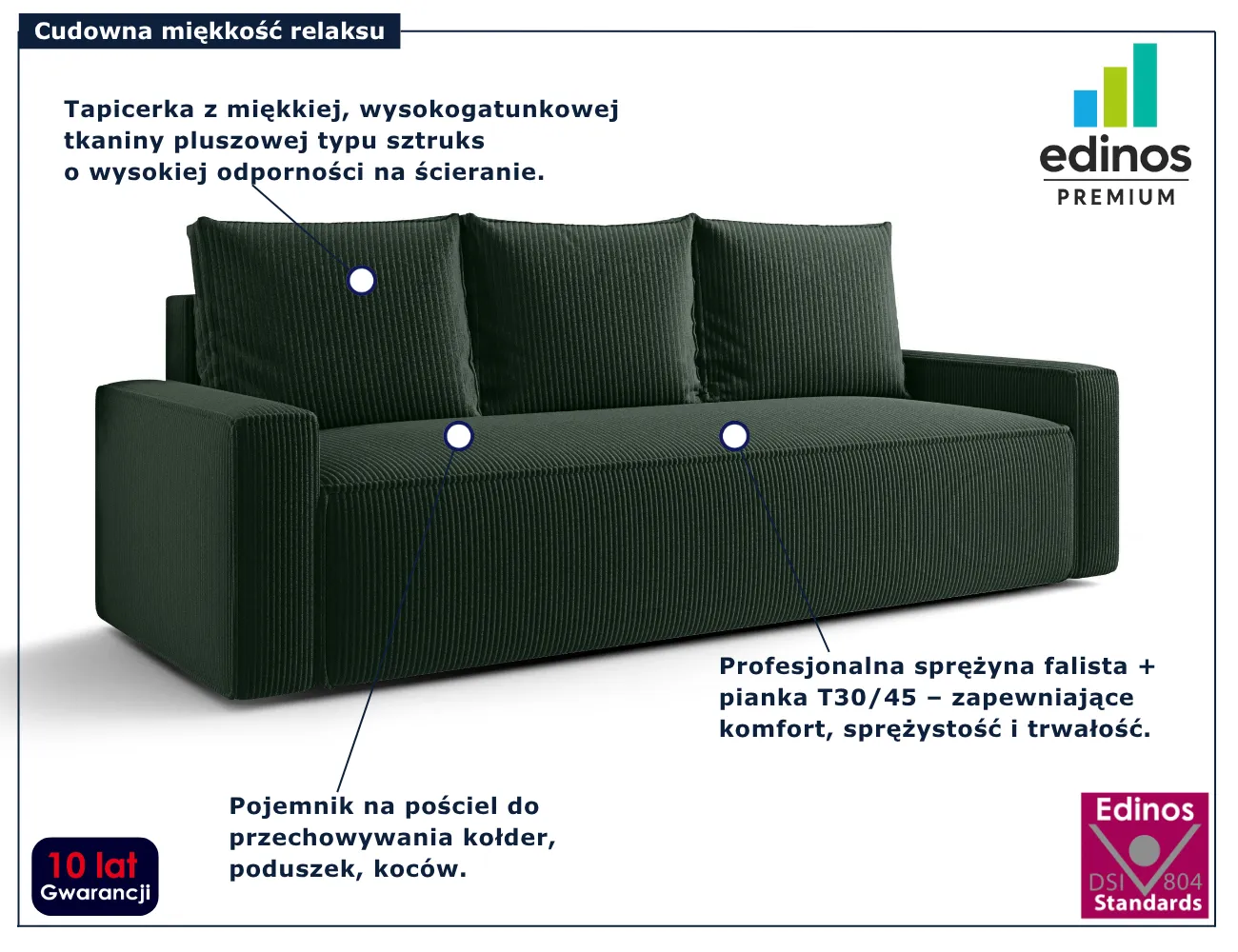 • Produkt posiada certyfikat jakości "Edinos Standards DSI 804", który potwierdza najwyższą jakość wykonania mebla oraz pełny stopień zgodności poszczególnych jednostek wytworzonego wyrobu z przyjętym wzorcem.