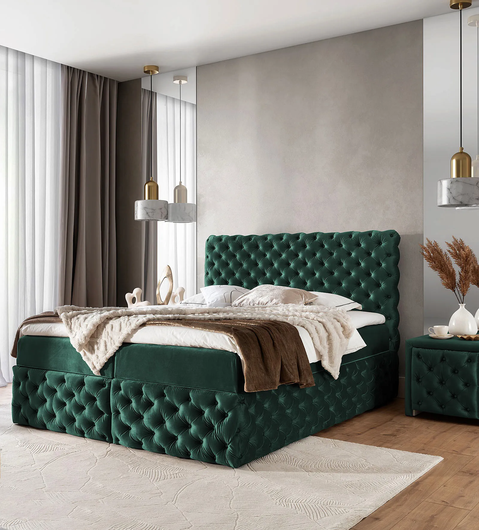Aranżacja wnętrza z zielonym łóżkiem Veltorio