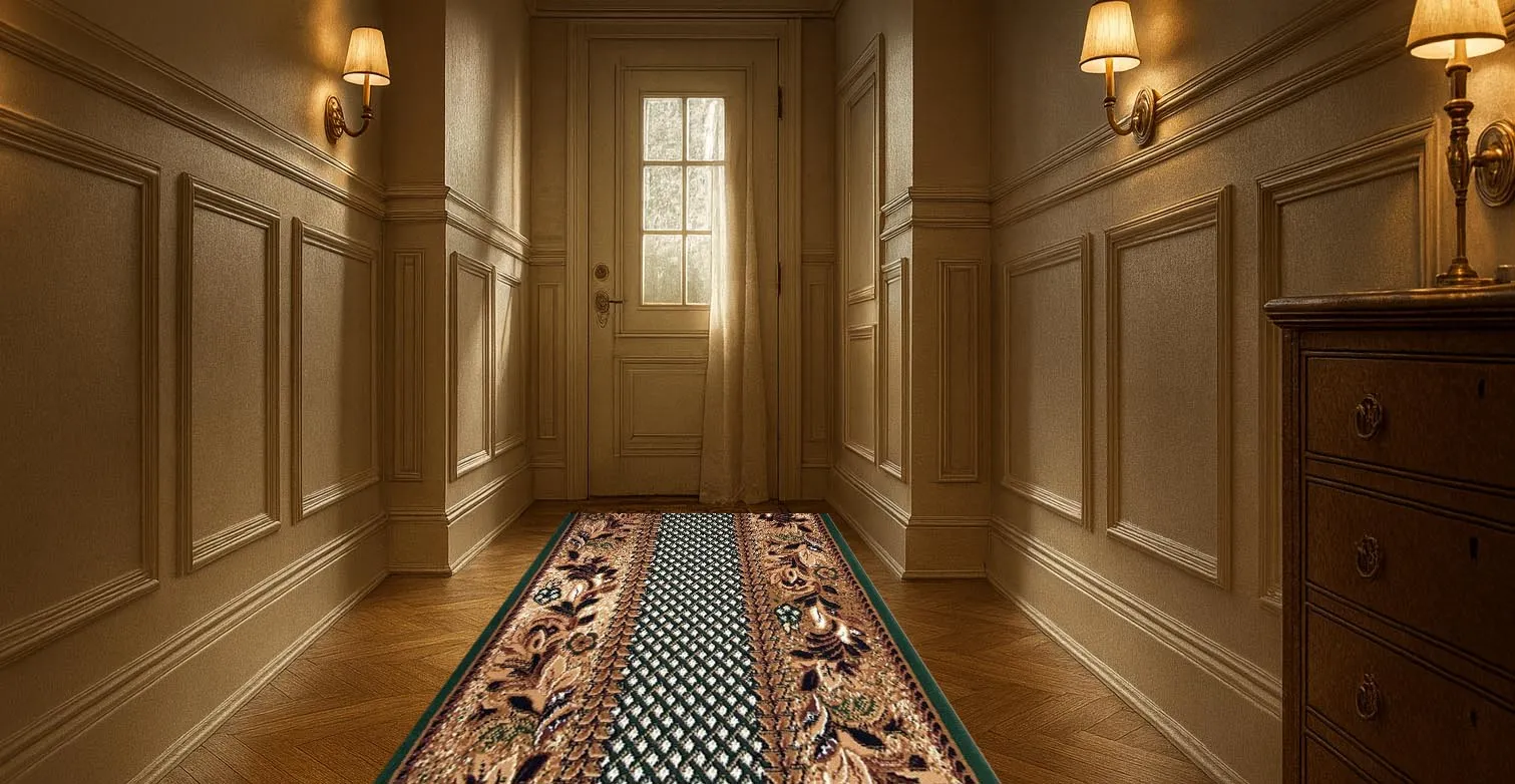 Zielony chodnik z wzorami na korytarz Erdo