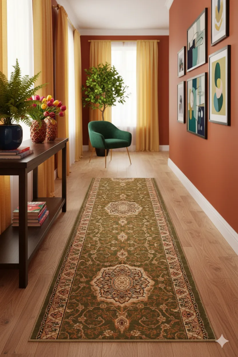 Chodnik jest bardzo ładny i stylowy. Zielony kolor świetnie ożywia pomieszczenie, a tradycyjny wzór dodaje klasyki. Cena promocyjna była bardzo atrakcyjna. Jedynym minusem jest fakt, że chodnik jest ręcznie tkany i może być delikatny, więc trzeba uważać na intensywne użytkowanie.