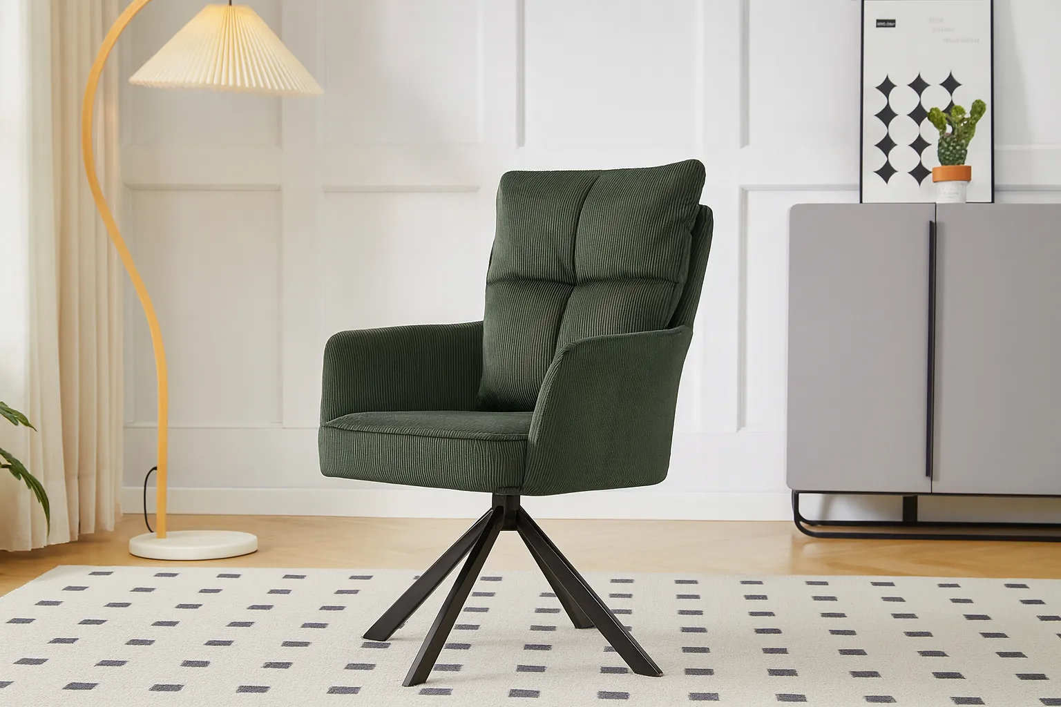 Sztruks trzyma się świetnie i to mimo intensywnego użytkowania nie widać śladów. Metalowa podstawa stabilna, design elegancki. Fotel dobrze komponuje się z jasnymi dodatkami.