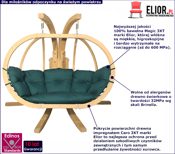 By produkt mógł dobrze służyć przez wiele długich lat powinien być zrobiony z najwyższej jakości materiałów. Zwróć uwagę z jaką starannością zrobiliśmy fotel wiszący Como 3X. Eksperci marki Elior konstrukcję wykonali z wysokogatunkowego drewna świerkowego. Świerk to świetny materiał budulcowy, jest trwały, odporny na uszkodzenia mechaniczne, a do tego jest lekki. Zapewniamy Cię, że stojak jest stabilny i bezpieczny. Najwyższa jakość surowca to za mało, trzeba jeszcze zadbać o jego odpowiednią ochronę. My tak zrobiliśmy. Stelaż fotela zabezpieczyliśmy impregnatem Caro 3XT, który przedłuży żywotność poszczególnych elementów oraz podkreśli atrakcyjny wygląd surowca. Impregnat Caro 3XT to profesjonalna ochrona drewna przed mchem, grzybami, pleśnią oraz dodatkowe wzmocnienie struktury drewna. Impregnat Caro 3XT skutecznie zabezpiecza drewno przed ekstremalnymi warunkami atmosferycznymi i środowiskowymi, jest odporny na deszcz i wilgoć. Zwróć uwagę, że drewno użyte do produkcji fotela zostało oznaczone certyfikatem gospodarki leśnej FSC. Atest ten przyznaje się jedynie lasom, których gospodarze troszczą się o zachowanie naturalnego ekosystemu, a do produkcji mebli wprowadzane są ekologiczne standardy. Meble wyróżnione certyfikatem FSC dają Ci poczucie komfortu, że otrzymujesz produkt bezpieczny i najwyższej jakości. Nie każdy producent mebli może pochwalić się takim wyróżnieniem.
