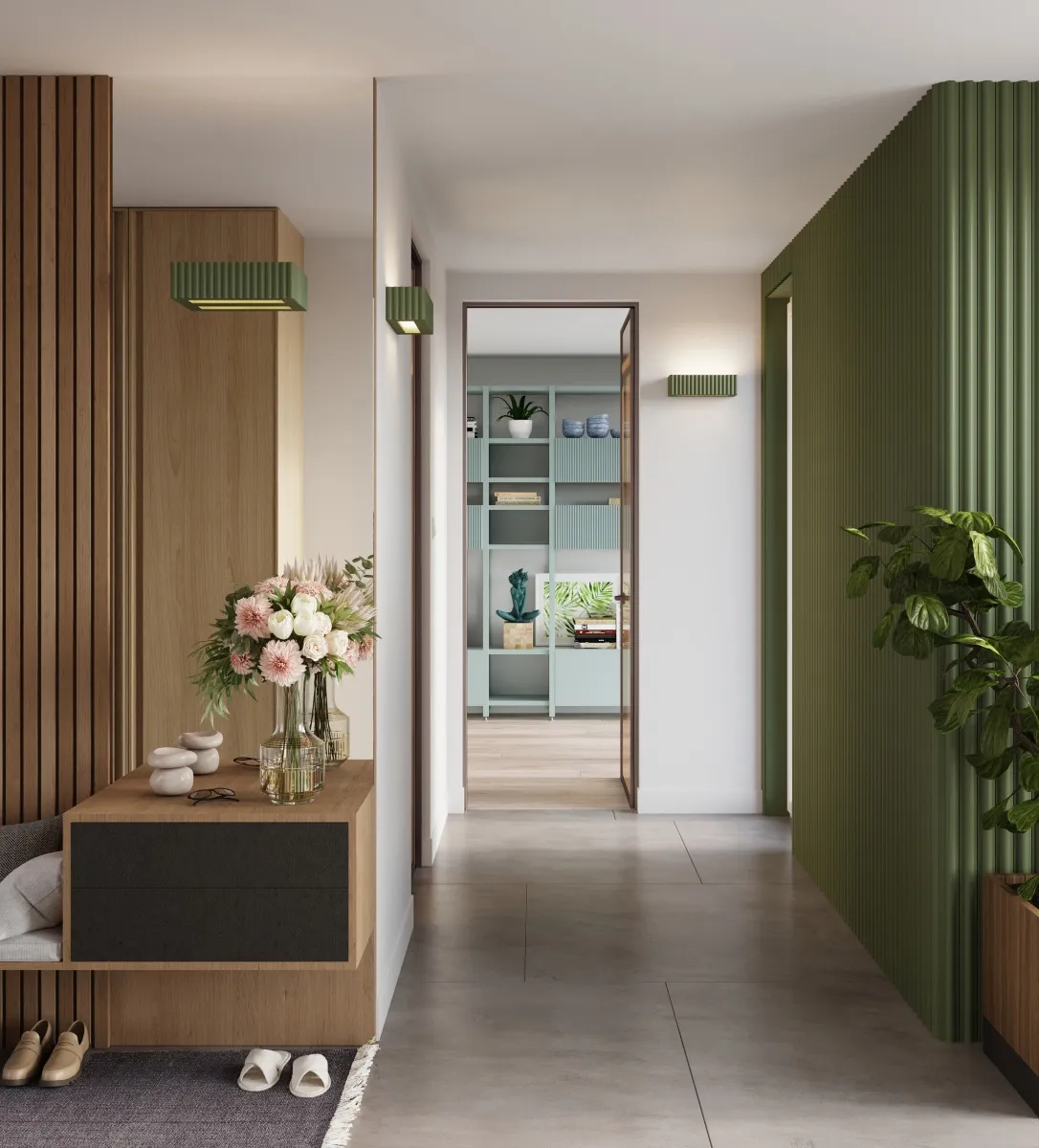 Wizualizacja przedpokoju z oliwkowym ceramicznym kinkietem - M167-Kasena