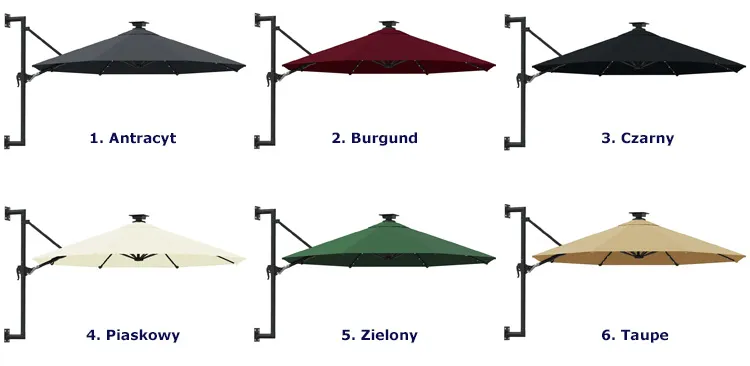 Zobacz wszystkie dostępne kolory parasola ściennego Waren i wybierz ten, który najbardziej przypadnie Ci do gustu.