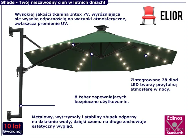 Waren to parasol, który nie tylko ochroni Cię przed słońcem, ale także stworzy magiczną atmosferę podczas letnich wieczorów. Dzięki zintegrowanym 28 diodom LED, otoczenie nabierze nastrojowego blasku, idealnego do relaksu i romantycznych spotkań. Marzysz o niepowtarzalnym klimacie na tarasie czy w ogrodzie? Parasol ścienny Waren marki Edinos Premium spełni Twoje oczekiwania, dodając wyjątkowego charakteru Twojemu otoczeniu.