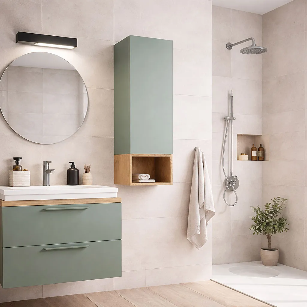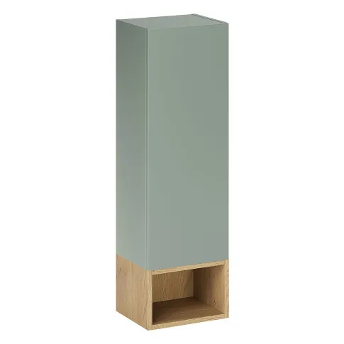 Półsłupek wiszący Verdessa 7X to praktyczne rozwiązanie dla osób, które chcą połączyć zamkniętą przestrzeń do przechowywania z lekką, nowoczesną formą. Smukła bryła montowana na ścianie pozwala efektywnie zagospodarować przestrzeń, jednocześnie zachowując wizualną lekkość wnętrza. Górna część z gładkim frontem umożliwia estetyczne ukrycie kosmetyków i akcesoriów, natomiast dolna, otwarta wnęka w dekorze drewna zapewnia szybki dostęp do najczęściej używanych przedmiotów. Matowy, zielony front w połączeniu z naturalnym wybarwieniem drewna podkreśla spokojny, harmonijny charakter kolekcji Verdessa.
