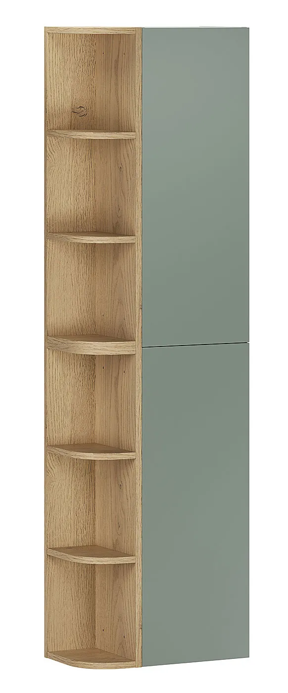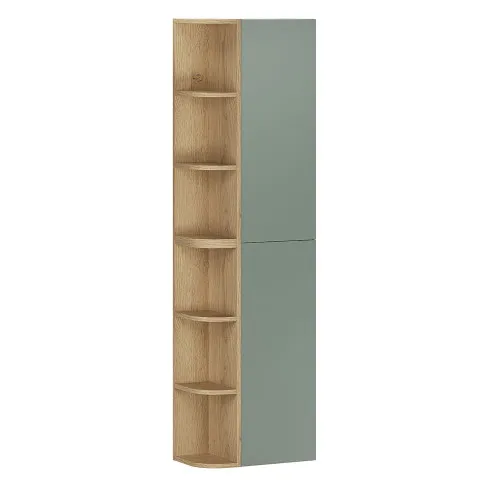 Słupek łazienkowy Verdessa 11X to idealne rozwiązanie dla tych, którzy chcą maksymalnie wykorzystać pionową przestrzeń, nie rezygnując z estetyki i lekkości aranżacji. Smukła bryła łączy zamkniętą część z gładkimi frontami oraz otwarte półki w dekorze drewna, które umożliwiają szybki dostęp do najczęściej używanych akcesoriów. Matowy, zielony front wprowadza do wnętrza spokój i wizualną harmonię, a naturalne wybarwienie drewna ociepla całość i nadaje jej przyjazny charakter. To mebel, który porządkuje łazienkę w sposób dyskretny, ale wyraźnie odczuwalny na co dzień.