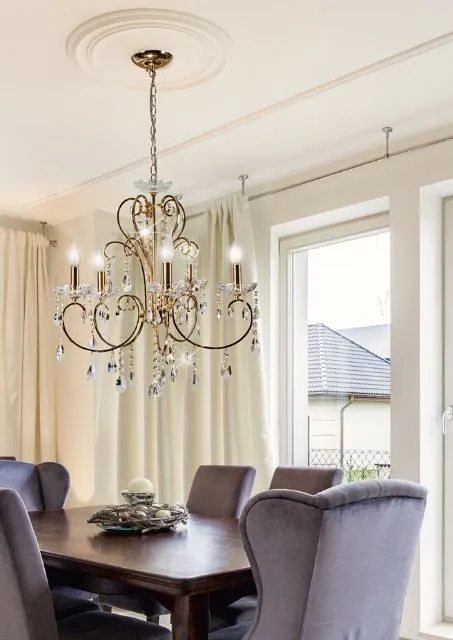 Niech cały Twój dom błyszczy z oświetleniem w stylu glamour. Wyjątkowy design naszej lampy K162-Fonti tworzą takie elementy jak kryształki, szklane talerzyki i faliste ramiona wykonane z wysokiej jakości metalu. Jesteśmy tak pewni jakości naszych produktów, że dajemy na nie aż dziesięć lat gwarancji! Lampa świetnie będzie wyglądała w atrakcyjnej sali balowej gdzie goście będą czuli się jak na królewskim przyjęciu. Fenomenalnie wpasuje się we wnętrza ekskluzywnych salonów piękności i kościołów. Pytanie tylko gdzie Ty go umieścisz? Ubogacisz swoje cztery ściany urządzone w klasycznym stylu czy może dodatkowo uatrakcyjnisz nim wnętrze w stylu glamour? Nasz produkt wszędzie będzie czuł się dobrze i wszędzie wprowadzi mase światła. Lampa prezentuje się jeszcze bardziej zjawiskowo z żarówkami w kształcie płomieni oraz z resztą lamp z serii Ekson, poznaj ich całą rodzinę i ciesz się elegancją każdego dnia.
