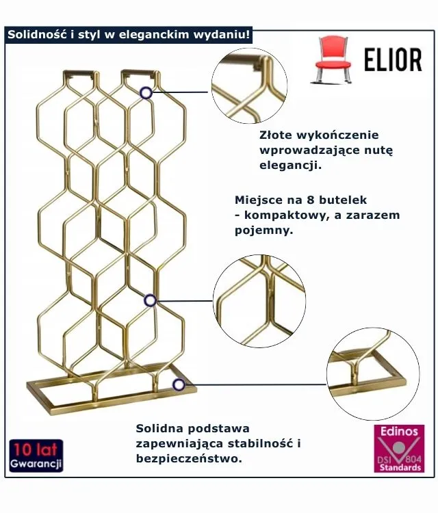 Złoty stojak na wino Zenwa marki Edinos Premium to doskonałe połączenie nowoczesnego designu z praktycznymi rozwiązaniami, które ułatwiają życie. Jeśli cenisz porządek, styl i wygodę – to właśnie ten model powinien znaleźć się w Twoim domu. Niezależnie od tego, czy przechowujesz wino na co dzień, czy tylko przy wyjątkowych okazjach – Zenwa pomoże Ci zrobić to z klasą. Nie czekaj, pozwól sobie na odrobinę luksusu w codziennym rytmie życia za jedyne 118 zł i spraw sobie stylowy prezent już dziś!