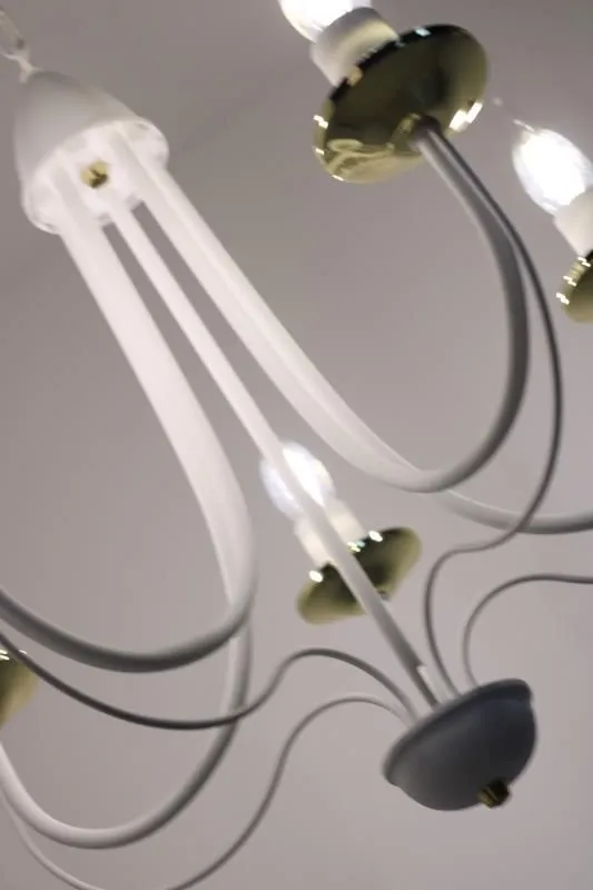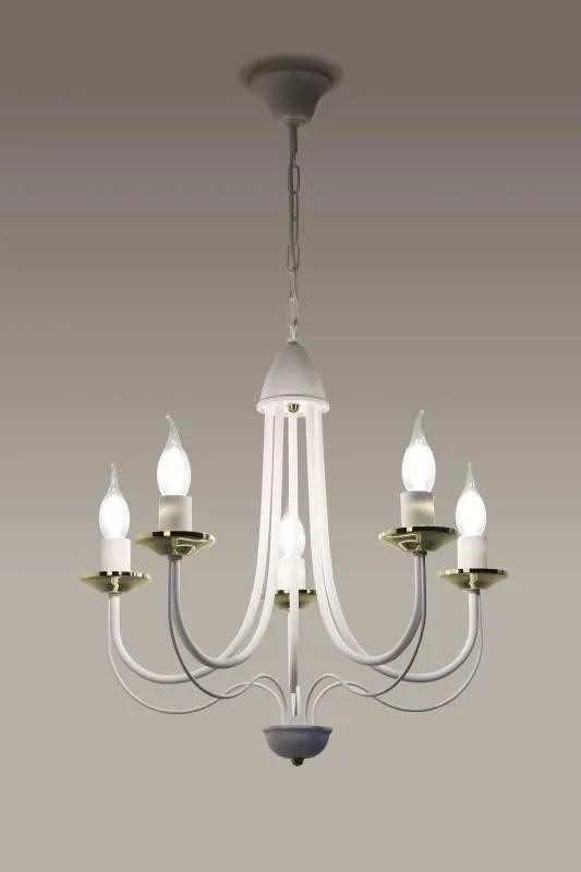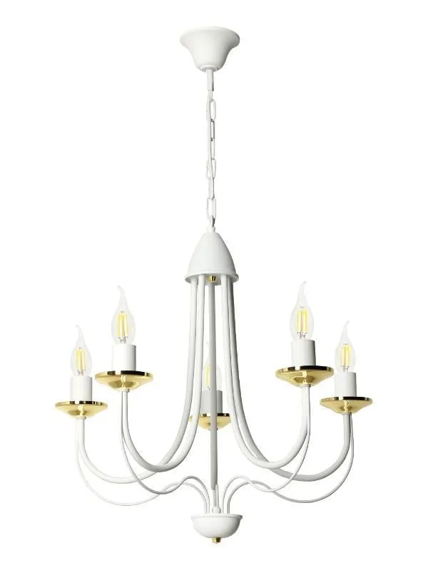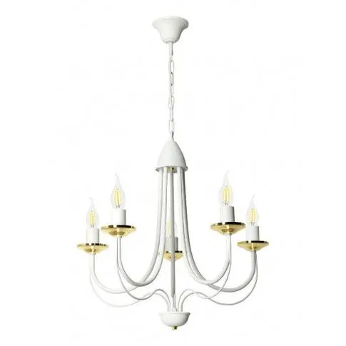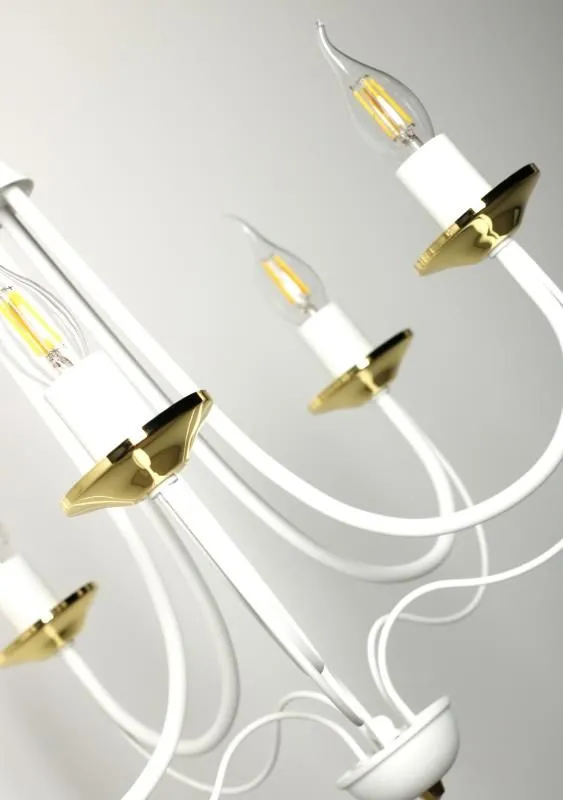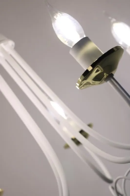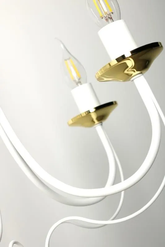 E235-Rivo to wspaniały żyrandol świecznikowy utrzymany w stylu vintage. Biały metalowy korpus w połączeniu ze złotymi akcentami tworzy wspaniały duet, a jego unikalny kształt wprowadzi do wnętrza niepowtarzalny, lekko tajemniczy klimat. Lampa została wykonana z materiałów najwyższej jakości, dzięki czemu prezentuje się wspaniale.